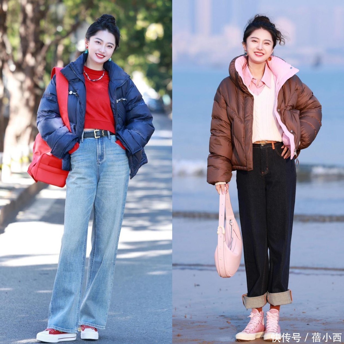 而这些斯文精还会尝试撞色搭配,比如口舌色的基础款羽绒服搭配一件彩色至意衫叠穿,一霎就丰富了咱们的造型,再搭配直筒牛仔裤和都踝短靴,轻轻佻松不错增高显瘦。