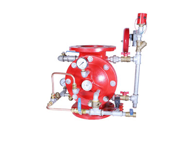 ZSFM型雨(yu)淋(lin)(lin)(lin)報(bao)(bao)警閥(fa)(fa)(fa)采用隔(ge)膜(mo)止回的(de)原理,在工(gong)作伺應(ying)狀(zhuang)態(tai)時(shi),雨(yu)淋(lin)(lin)(lin)報(bao)(bao)警閥(fa)(fa)(fa)內的(de)隔(ge)膜(mo)腔(qiang)將(jiang)消防(fang)水(shui)(shui)封(feng)閉(bi)于 管網供水(shui)(shui)側(ce),系(xi)(xi)統(tong)側(ce)管網中(zhong)(zhong)沒有水(shui)(shui),隔(ge)膜(mo)處于關閉(bi)狀(zhuang)態(tai)。該系(xi)(xi)統(tong)是由主閥(fa)(fa)(fa)、水(shui)(shui)力警鈴、開(kai)式噴(pen)頭及火(huo)(huo) 災(zai)報(bao)(bao)警控(kong)(kong)(kong)制(zhi)系(xi)(xi)統(tong)組成(cheng)的(de)噴(pen)水(shui)(shui)滅(mie)火(huo)(huo)系(xi)(xi)統(tong)。失(shi)火(huo)(huo)時(shi),當保護區內探(tan)測(ce)(ce)器(qi)將(jiang)測(ce)(ce)得的(de)火(huo)(huo)災(zai)信(xin)號傳送至控(kong)(kong)(kong)制(zhi)中(zhong)(zhong)心, 再由控(kong)(kong)(kong)制(zhi)中(zhong)(zhong)心將(jiang)信(xin)號處理后,向雨(yu)淋(lin)(lin)(lin)閥(fa)(fa)(fa)上(shang)的(de)電(dian)(dian)磁閥(fa)(fa)(fa)發出啟(qi)動信(xin)號,電(dian)(dian)磁閥(fa)(fa)(fa)打開(kai),隔(ge)膜(mo)腔(qiang)泄壓,雨(yu)淋(lin)(lin)(lin)閥(fa)(fa)(fa) 開(kai)啟(qi),消防(fang)泵啟(qi)動,水(shui)(shui)從供水(shui)(shui)側(ce)進(jin)入(ru)系(xi)(xi)統(tong)管網,通過開(kai)式噴(pen)頭噴(pen)向保護區,以達到(dao)報(bao)(bao)警、滅(mie)火(huo)(huo)、控(kong)(kong)(kong)火(huo)(huo)目 的(de)。適用于易結冰或火(huo)(huo)災(zai)危險(xian)性大需重點保護的(de)建筑物(wu)和(he)場(chang)(chang)地。例(li)如:醫院、賓館、商場(chang)(chang)、工(gong)廠、機 場(chang)(chang)、娛樂(le)場(chang)(chang)、圖(tu)書館、體育場(chang)(chang)、會展中(zhong)(zhong)心、變(bian)電(dian)(dian)站等場(chang)(chang)所。
